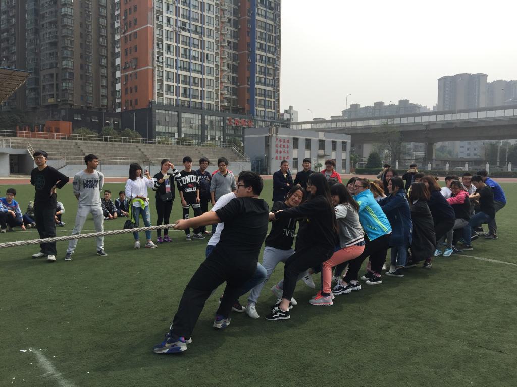 12:30比赛正式开始,各班参赛队员站好位置、蓄势待发,哨声一响,双方队员很快进入状态,把自己的全部力气系在一根长长的麻绳上。在场的女生也不甘示弱,手磨的发紫,也没有一个人退缩,和男生一起坚持到底。最后,11支队伍中决出了3支获胜队伍进入决赛。