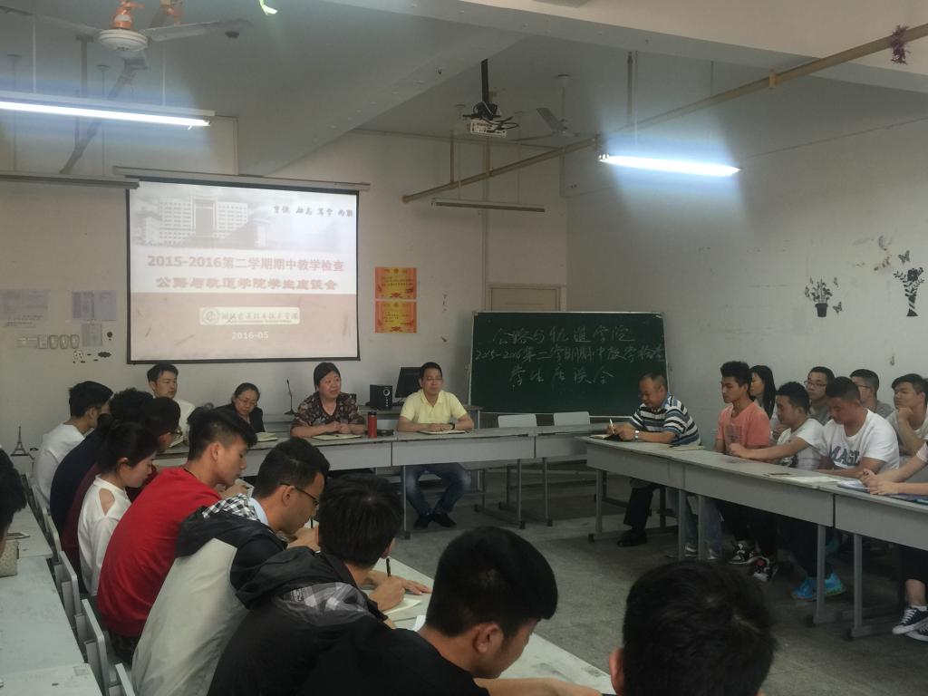 5月4日下午4点20,公路与轨道学院在实训中心508教室召“2015-2016学年度第二学期期中教学检查学生座谈会”。学院领导、督导、各教研室主任及各班学生代表参加了座谈会。