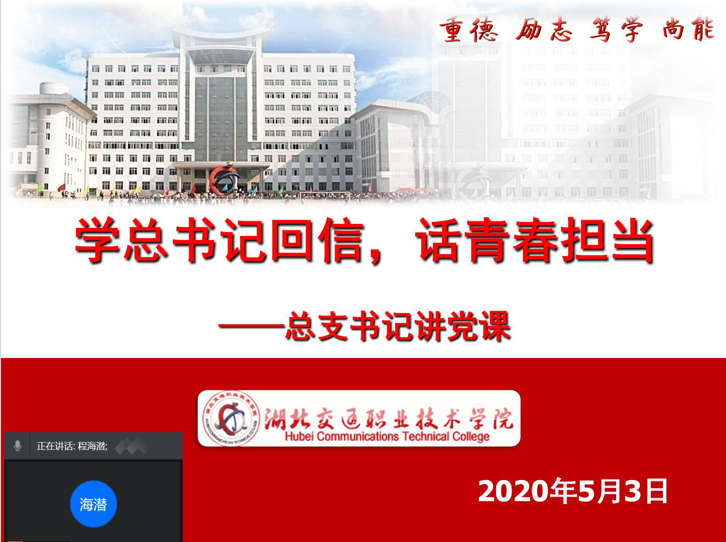 5月3日中午,公路与轨道学院党总支书记程海潜为我院第50期全体入党积极分子讲题为《学总书记回信,话青春担当》专题党课。此次专题党课以线上会议形式进行,学生支部委员及54名入党积极分子参加此次会议。