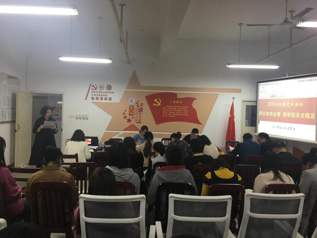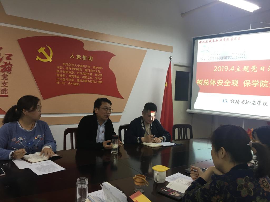 4月28日下午,公路与轨道学院党总支在G506党员活动室开展以“树总体安全观 保学院安全稳定”为主题的支部主题党日活动,公路与轨道学院全体党员老师参加了会议。学校领导陈方晔同志以普通党员的身份参加了主题党日活动,并进行了交流发言。