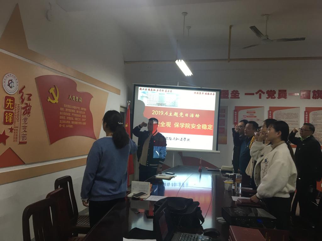 主题党日活动按照“4+N”模式进行,缴纳党费、奏唱国歌、重温入党誓词、学习《党章》总纲第九自然段,并集中学习了第十三届全国人大二次会议政府工作报告,传达并学习了习近平总书记参加部分代表团2019审议“两会”的报道、全省教育大会精神、习近平同志在学校思想政治理论课教师座谈会上的重要讲话精神、《蒋超良在省纪委第十一届三次全体会议上的讲话》、《王立山在省纪委十一届三次全会上的报告》。