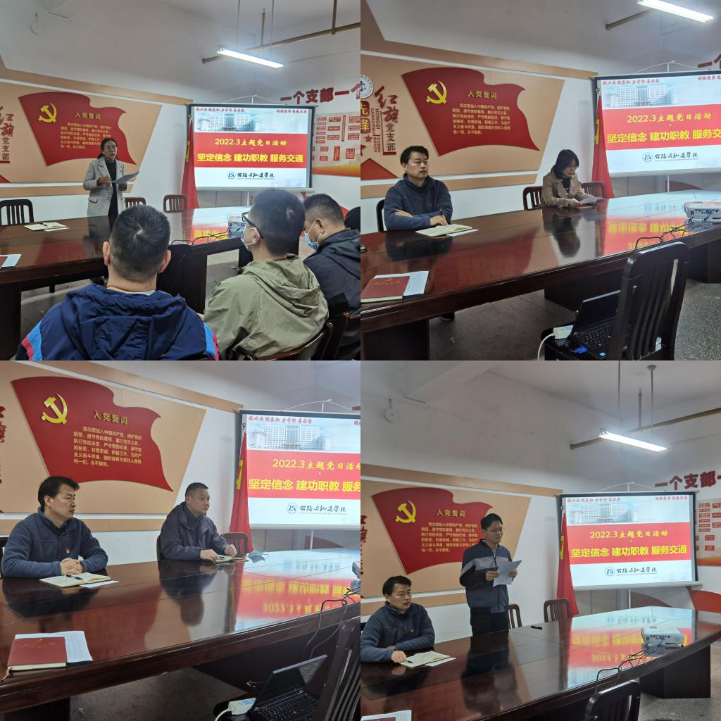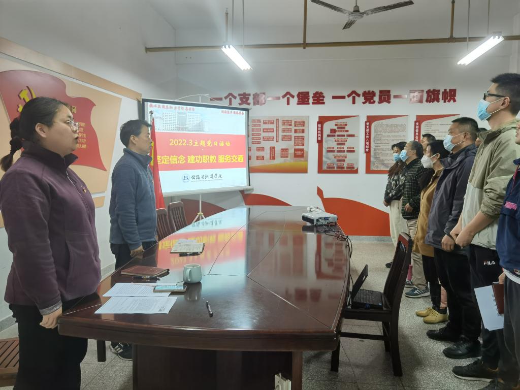 根据省交通运输厅《关于2022年3月份支部主题党日活动安排的通知》和学校党委有关通知要求,3月17日下午,公路与轨道学院党总支在党员活动室开展了以“坚定信念 建功职教 服务交通”为主题的党日活动,学院全体党员参加了本次活动。