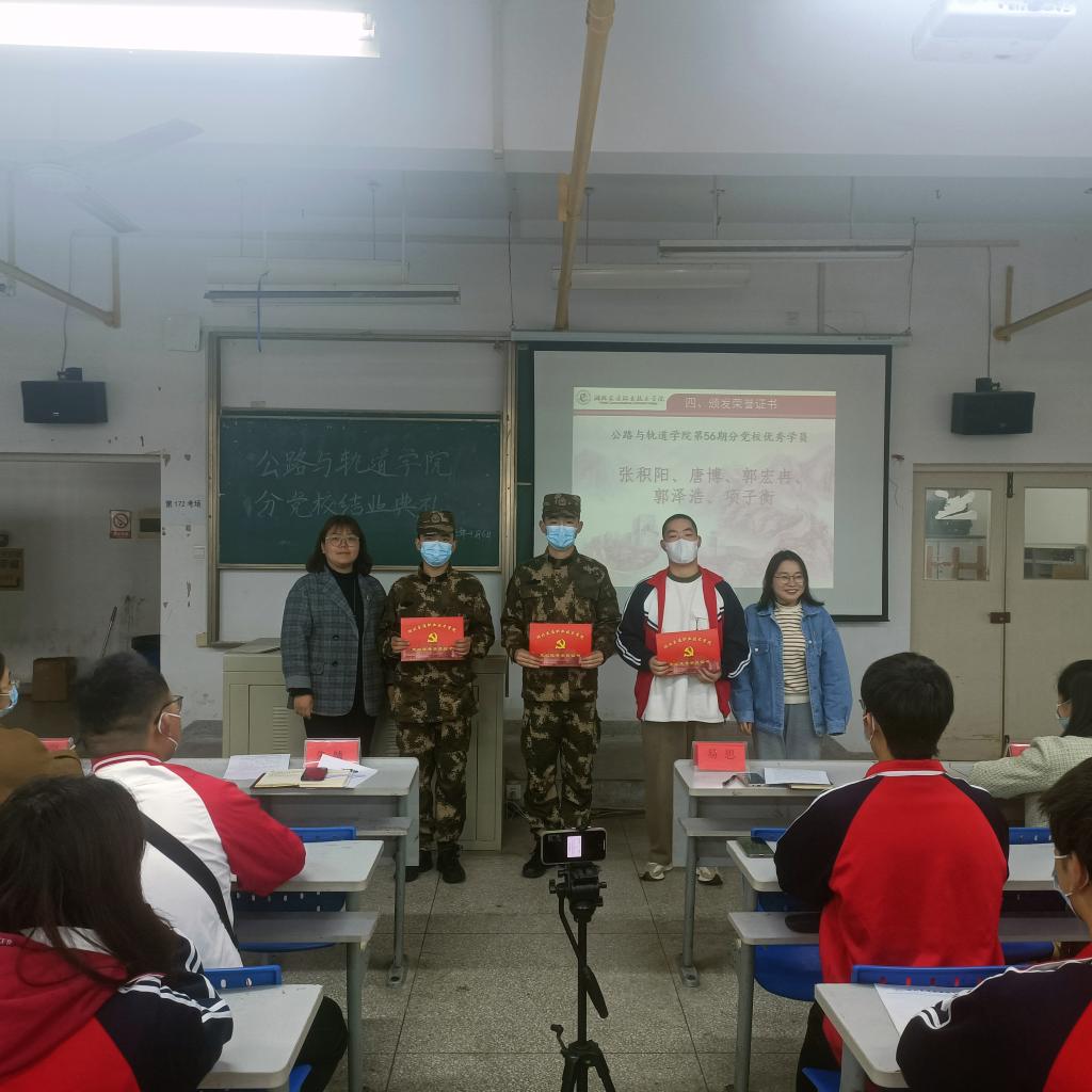 4月6日下午2:30,公路与轨道学院第56期入党积极分子党校结业典礼在实训中心603教室顺利举行。学院党总支专职副书记朱婧、学生党支部书记易思、专职组织员邵丹怡、党校教师及56期党校全体学员110余人参与此次典礼。