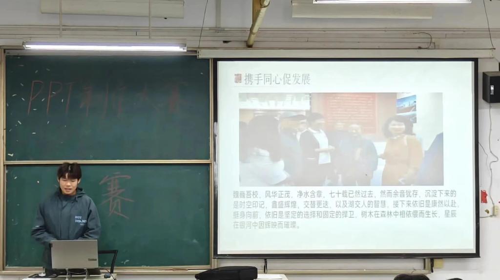 整场比赛精彩纷呈。参赛者依次上台进行演讲PPT,同学们铿锵有力的声音和创作的PPT将整个活动推向高潮,他们分享了学校的概况、发展变迁过程,学校历史上的杰出校友、重要成就等,还有同学分享了校园风光,“重德、励志、笃学、尚能”的校训,大家将情感带入讲演中,让听众感受到了学校历经的光辉岁月,为学校的七十周年描绘出美丽的画卷。