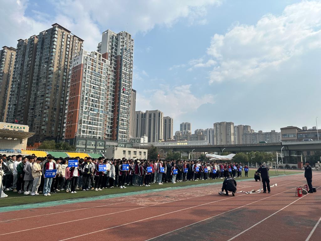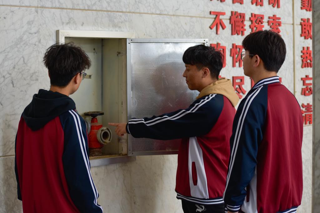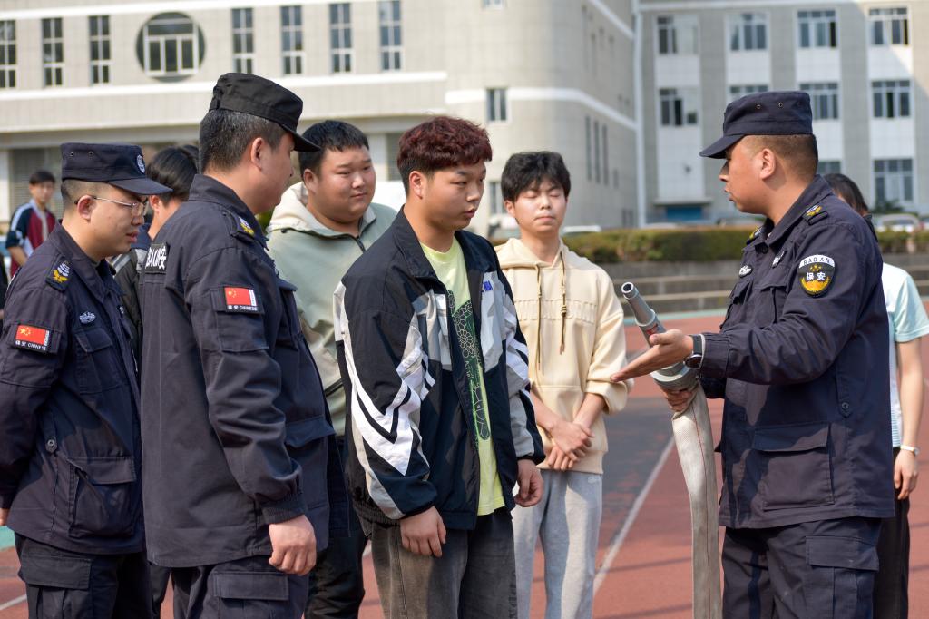 模拟警情的铃声响起,同学们在老师和楼道指挥员的引导下快速有序撤离。撤离过程中,学生精准掌握逃离动作要领,做到听从指挥、不推不挤,800余名同学有序安全撤离到足球场集合区域,仅用时2分57秒。疏散结束后,保卫处董队长从消防器材介绍及使用、灭火方法及注意事项等方面进行了详细讲解,现场演示了灭火器和消防栓的使用方法、火灾扑救过程、具体操作步骤,介绍了校园内的灭火器和消防栓存放的位置,并与学生进行互动操作。