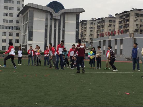参加此次活动分为踩气球和撕名牌两个阶段.踩气球活动时将参赛选手分为A组,B组,C组,学姐学长组四个组,将其脚下绑上气球,通过抽签两两对抗。最为激烈的当然是撕名牌活动,参赛选手分为大一学生组和大二干事两组,在锣鼓队的欢呼下,大家都玩得特别尽兴。双方都很有技巧的根据“对方”每个人特点,联合起来撕名牌,最终将“跑男”活动推向高潮。(摄影/陈阳)
