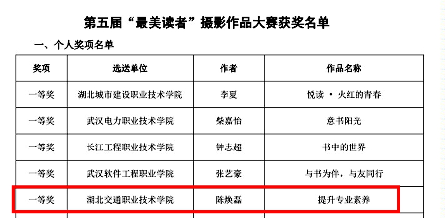 11月11日,湖北省高职高专院校第五届“最美读者”摄影大赛圆满落幕。我校物流与交通管理学院学生陈焕磊的摄影作品《提升专业素养》荣获一等奖。