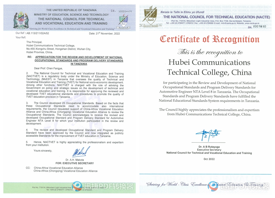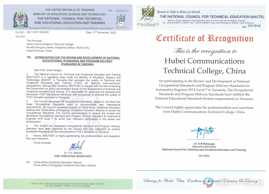 近日,从坦桑尼亚国家职业教育委员会、中非职业教育联盟传来喜讯,由我校承担开发完成的第一批坦桑尼亚国家职业标准开发项目——汽车工程师7级、汽车工程师8级两项职业标准,以及配套人才培养方案等专业教学标准顺利通过坦桑尼亚国家职业教育委员会审核,获得官方认证,正式纳入坦桑尼亚职业教育体系。这是我校首次承担国际职业教育标准制定,实现标准对外输出,对我校国际化发展具有重要的里程碑意义。