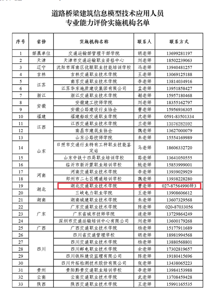 近日,交通运输部职业资格中心公布了首批申报道路桥梁建筑信息模型技术应用人员专业能力评价项目实施机构名单,我校成功入选。