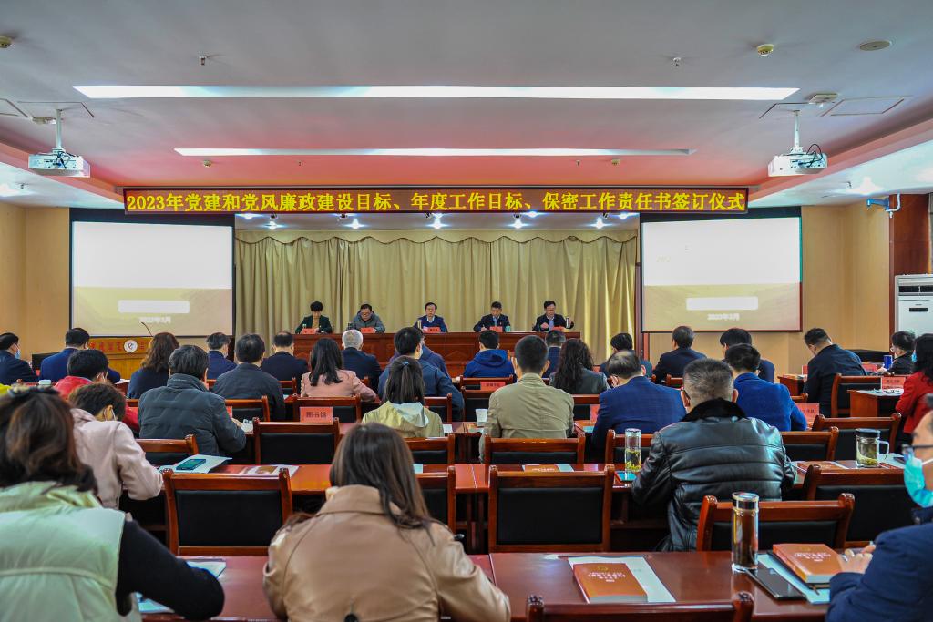 3月27日,学校在培训楼三楼多功能厅举行2023年党建和党风廉政建设目标、年度工作目标、保密工作责任书签订仪式,为全面推进学校“双高建设决胜年”压实责任,吹响号角。全体校领导、各部门负责人及副科级以上干部出席会议,仪式由党委副书记、副校长李全主持。