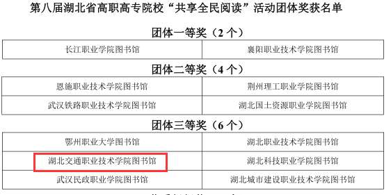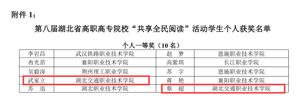 6月3日,第八届湖北省高职高专院校“共享全民阅读”活动圆满结束。我校航海学院学生武家立、建筑与艺术设计学院学生蔡超分获个人一等奖,公路与轨道学院学生赵加成获个人优秀奖,我校获团体三等奖。