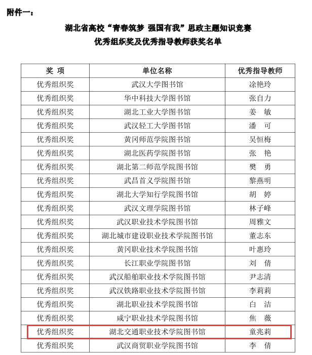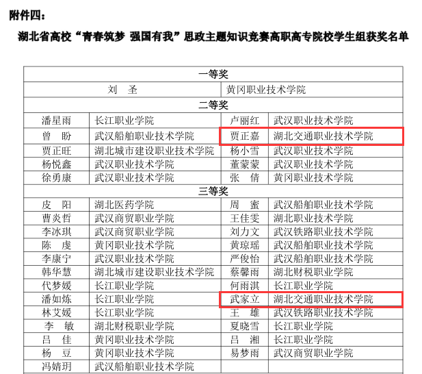 湖北省高校“青春筑梦 强国有我”思政主题知识竞赛活动于4月20日至5月26日举行。我校汽车与航空学院学生贾正嘉获高职组个人二等奖,航海学院学生武家立获三等奖,汽车与航空学院学生马明、航海学院学生靳泽成获优秀奖,我校图书馆获优秀组织奖。
