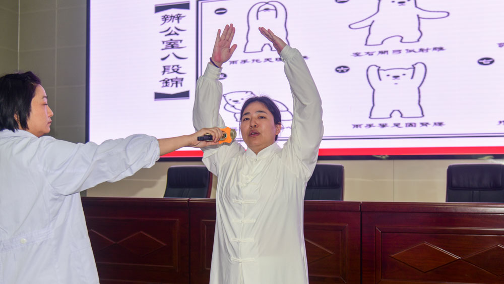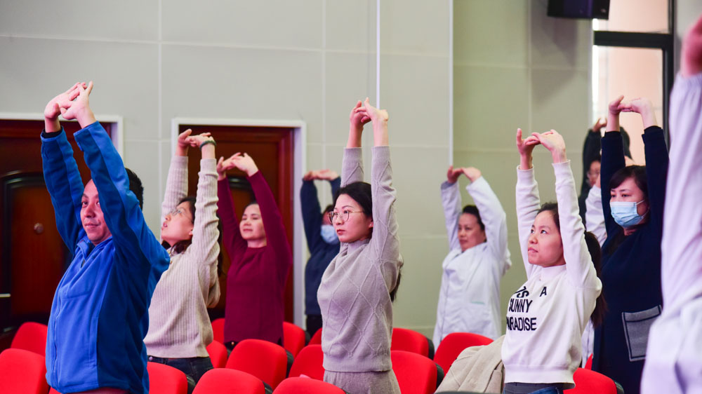 刘川主治医师面向教职工们进行了中医传统功法——八段锦的教学,大家都积极参与其中,现场活跃度非常高,许多教职工纷纷表示效果非常明显。
