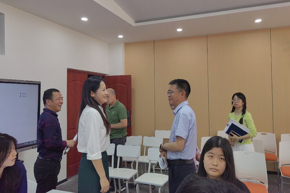 公开课结束后,李建明与刘群进行交流时,充分肯定了她精彩纷呈的课堂教学,抽丝剥茧的教学方法,生动有趣的授课语言,勉励教师们继续专注课堂教学,持续提高授课质量。(摄影/夏丽平)