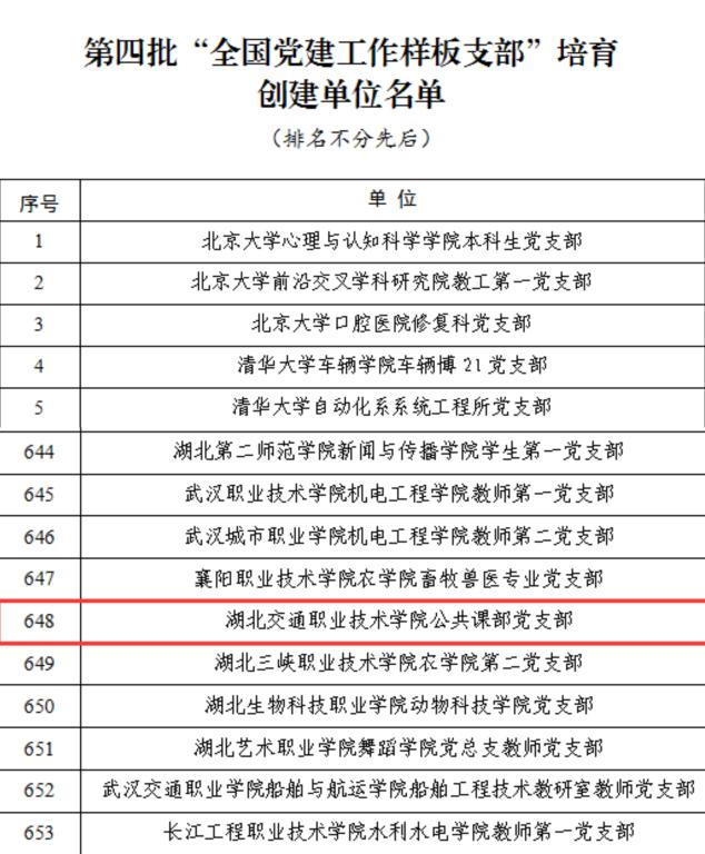 近日,教育部办公厅公布了第四批全国党建工作示范高校、标杆院系、样板支部培育创建单位名单,我校公共课部党支部成功入选第四批“全国党建工作样板支部”培育创建单位,这也是学校第3个国家级党建示范创建和质量创优项目。