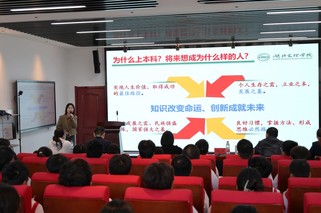 陈铭以“志存高远、能力导向、自律自强,锻造美好未来基石”为题,从湖北文理学院地理概况、汽车与交通工程学院总体建设情况、科技创新成果以及人才培养成效等四个方面为同学们介绍了本科阶段学习的师资力量、学习环境和专业实力。他就“如何成为一名优秀的学生”,向同学们提出“让勤奋成为常态、优秀成为习惯,用自律成就梦想”的期许和要求,并发出“在隆中,等待你谋天下”的邀请。马强从3+2联培的专业地位、专业建设情况等方面为同学们做了专业引导,并鼓励同学们以赛促学,多参加技能大赛,为三年后的本科学习构筑坚实的基础。