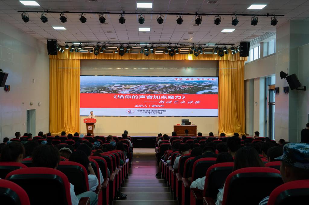 为全面落实学校2025年职教周工作部署,推广普通话,提升学生语言表达水平,5月28日下午,公共课部特邀中宣部学习强国学习平台朗诵播音专家团成员、中国诗歌学会朗诵演唱专业委员会委员、湖北省朗诵艺术家协会会长谢东升莅临我校,开展“给你的声音加点魔力——朗诵艺术讲座”。学校党委副书记、副校长谢彤,各二级学院、公共课部近300名师生参加了讲座。