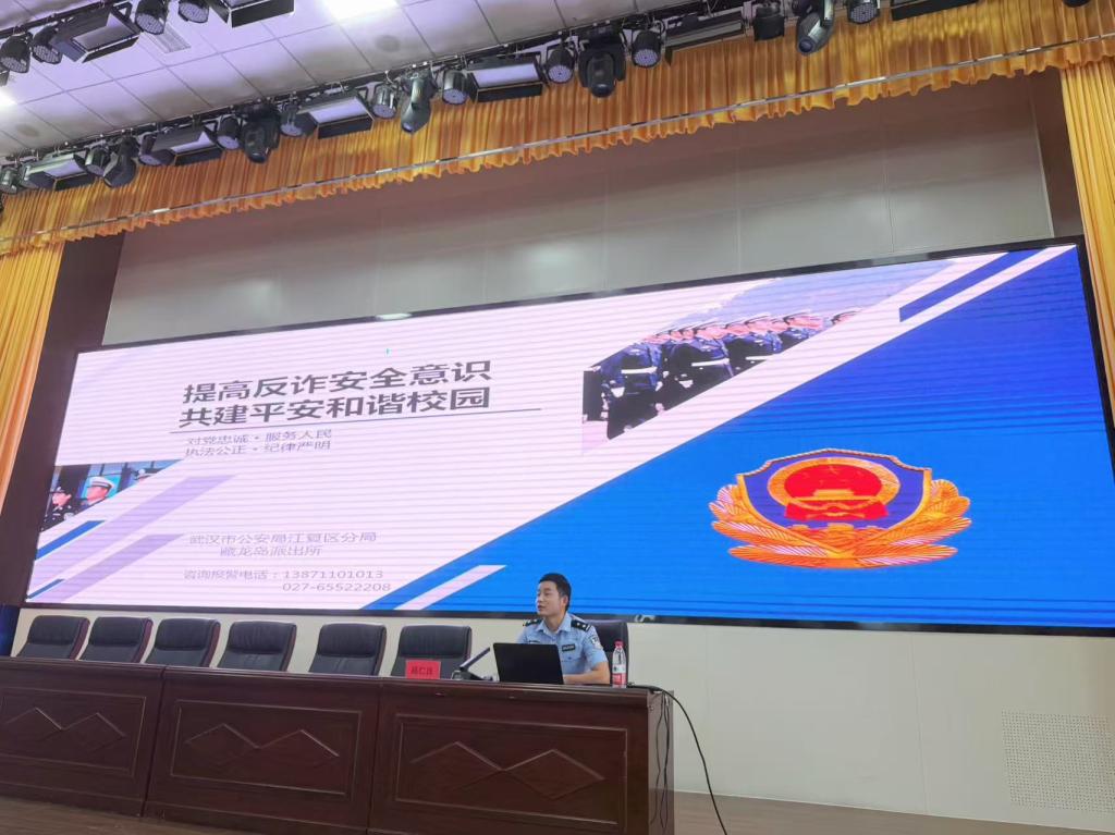 6月5日,武汉市公安局江夏区分局藏龙岛派出所民警陈仁良在我校带来了一场主题为“提高反诈安全意识,共建平安和谐校园”的反诈专题教育讲座。保卫处、学生工作处及一百余名师生代表聆听了讲座。