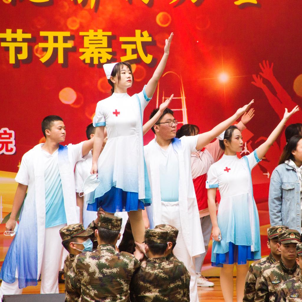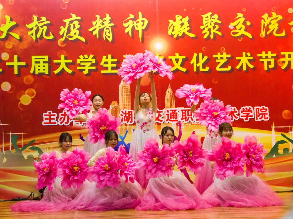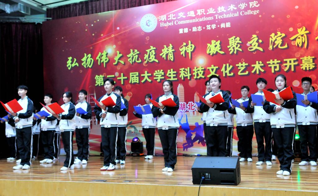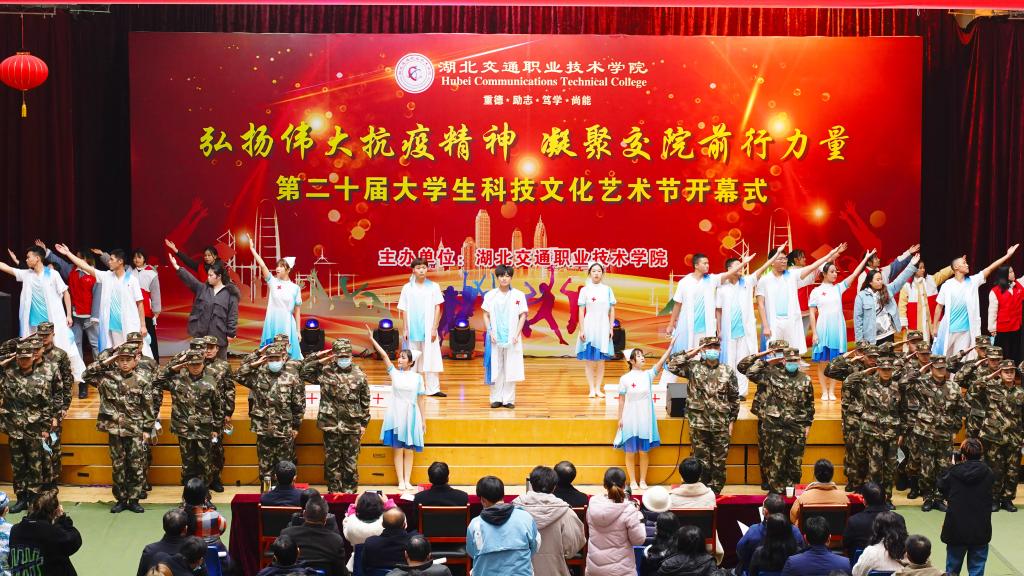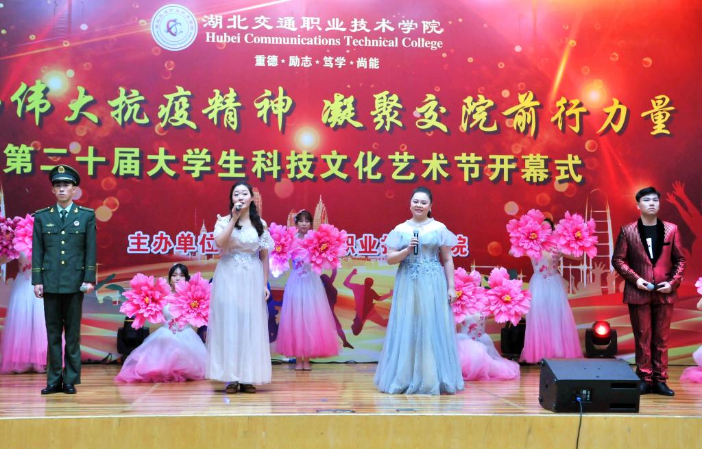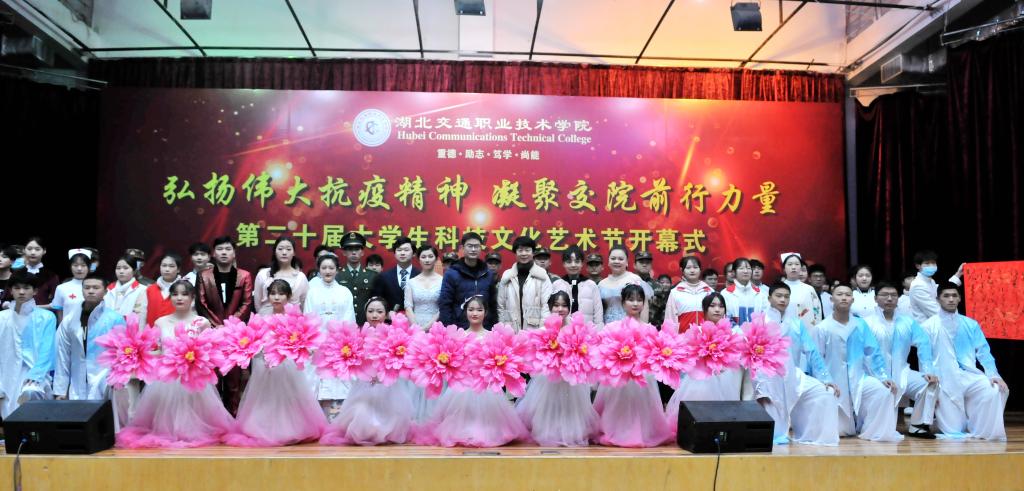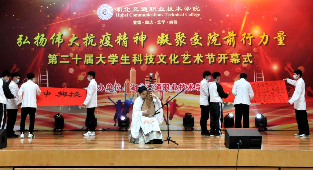 一台气势磅礴、令人动容的大型情景舞蹈《聚·涅槃》拉开了本次开幕式的序幕,讲述了军人、医生、民众齐心协力,聚力抗疫的故事,展现了中华儿女生命至上、举国同心、舍生忘死、尊重科学、命运与共的抗疫精神。在学子才艺展示环节,交通信息学院胡心雨演奏了其荣获第十五届武汉市高校艺术节银奖的琵琶演奏曲《春江花月夜》,在悠悠琴声中,学校书法协会黄祥雨、郄震两位学子现场挥毫,笔走龙蛇,以琴墨辉映展现了中国传统文化之美;士官班学子赵玉桥现场演唱其获得2020爱乐华声国际音乐盛典湖北赛区非专业组一等奖歌曲《两地曲》,诗情画意的歌词,奔放却不失含蓄的歌声淋漓尽致地展现了这首浪漫柔情的歌曲;公路与轨道学院学子李朝阳带来独舞《北望河山》,该舞荣获第十五届武汉市高校艺术节银奖作品,以快慢交替、刚柔并济的舞蹈动作展现了北望河山的复杂情感。师生共同演绎的歌伴舞《不忘初心》,以富有感染力的舞蹈、深情朴实的歌词、大气恢弘的旋律、浑厚高昂的歌声展现了国人在最美中国道路上不断前行的拳拳初心。湖北交院之声广播台带来的朗诵《铭记校训,砥砺前行》,解读了我校校训“重德 励志 笃学 尚能”的精神内涵,展现了我校良好的校园文化和精神风貌,学子们激情四射、慷慨激昂的朗诵将校训文化展现得淋漓尽致,赢得了现场潮水般的掌声。最后,开幕式在师生齐唱校歌《路在心上》中落下帷幕。