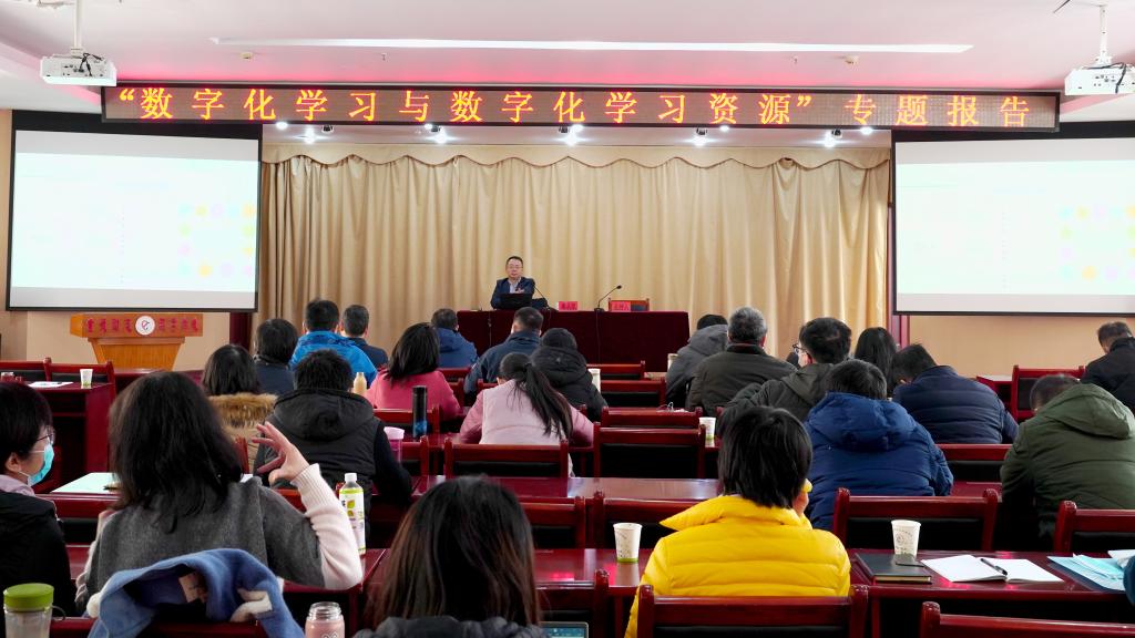 为服务我校双高建设,全面提高教师数字化学习水平,12月4日,教务处特邀国家开放大学数字化学习资源中心主任单从凯前来我校作数字化学习与数字化学习资源的专题报告。副校长王孝斌、各二级学院负责人、教学科研相关部门负责人及部分一线教师参加学习。