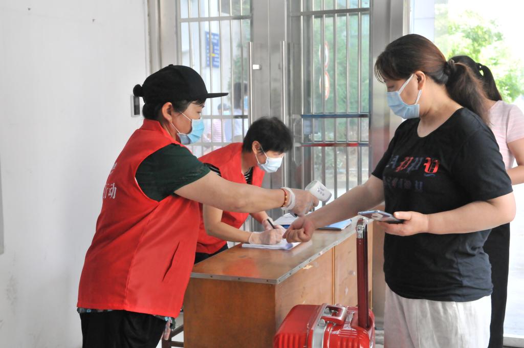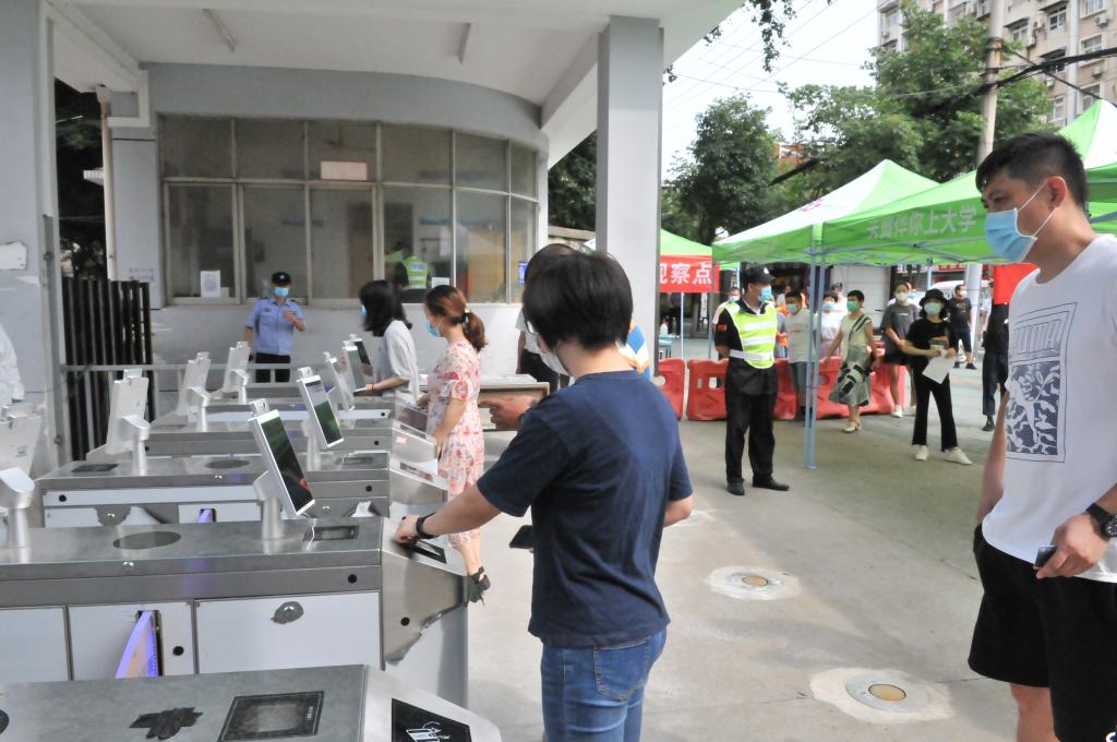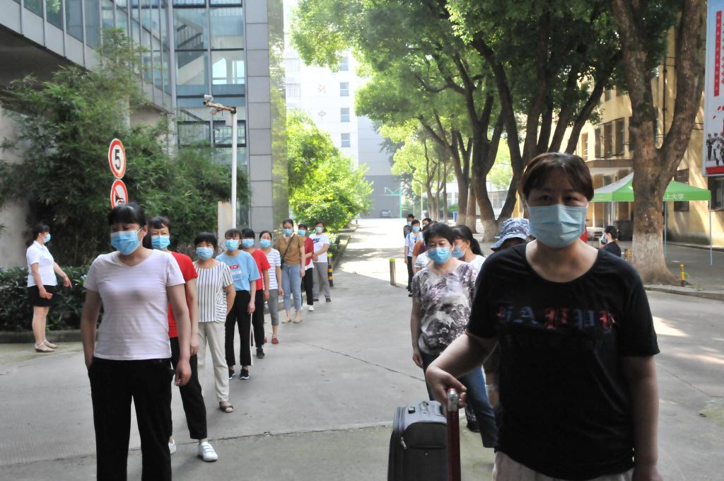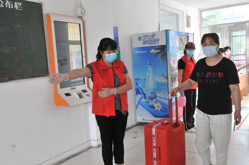 入校检查无异常的同学则跟随志愿者来到其学院的报到点,再次复核身份并登记、并领取防疫物资。在做好信息记录后,学生回到所住宿舍楼。在宿舍楼门口,宿管员要对学生信息进行再次核对、检测体温、消毒行李,之后方可进入到宿舍。
