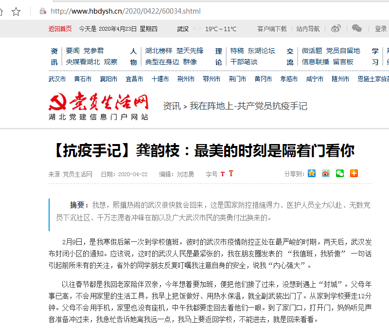 在这场突如其来的疫情面前,学校党员干部响应党的号召,主动下沉社区,用行动书写无悔誓言,用无私奉献彰显使命担当,为记录学校党员干部在抗疫工作中坚守社区、冲锋一线的感人事迹,以小视角见证大时代,以个人故事展现党员冲锋情怀,我校组织部择优向湖北省委组织部《党员生活》杂志推荐了16篇下沉党员的抗疫手记。在第25个世界读书日,我校龚韵枝同志抗疫手记在党员生活网上刊发,特转载以飨读者。