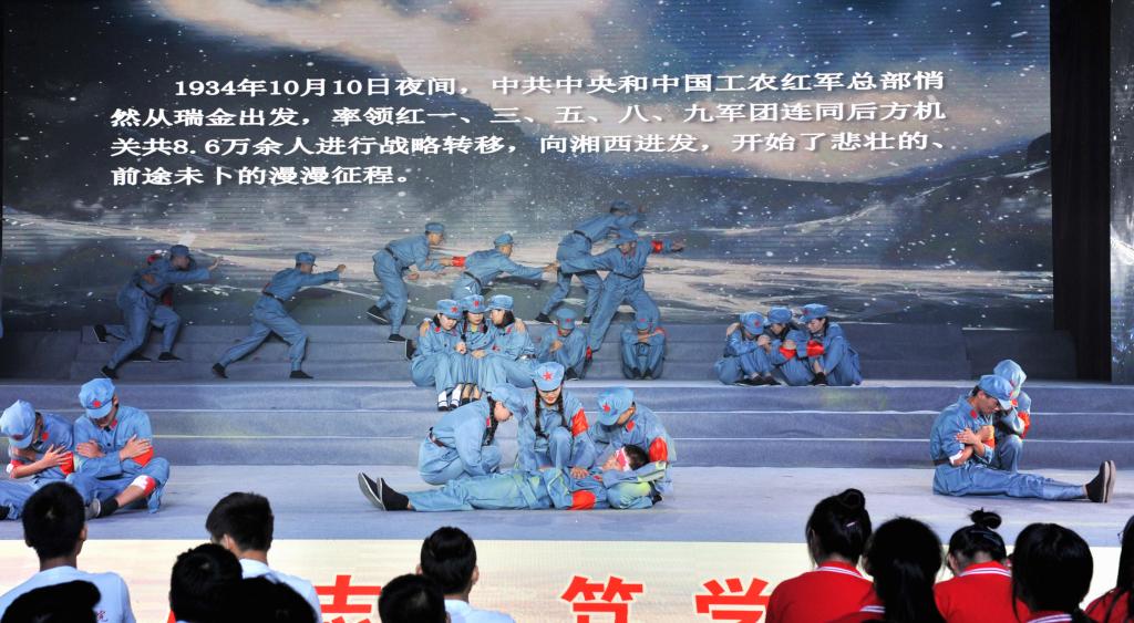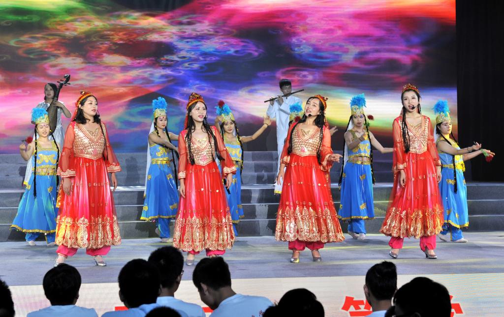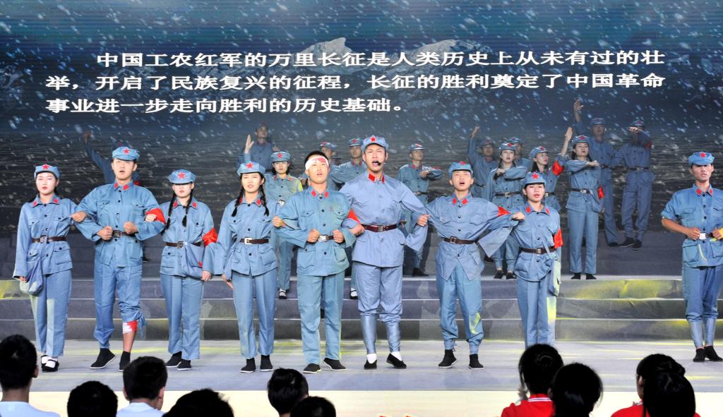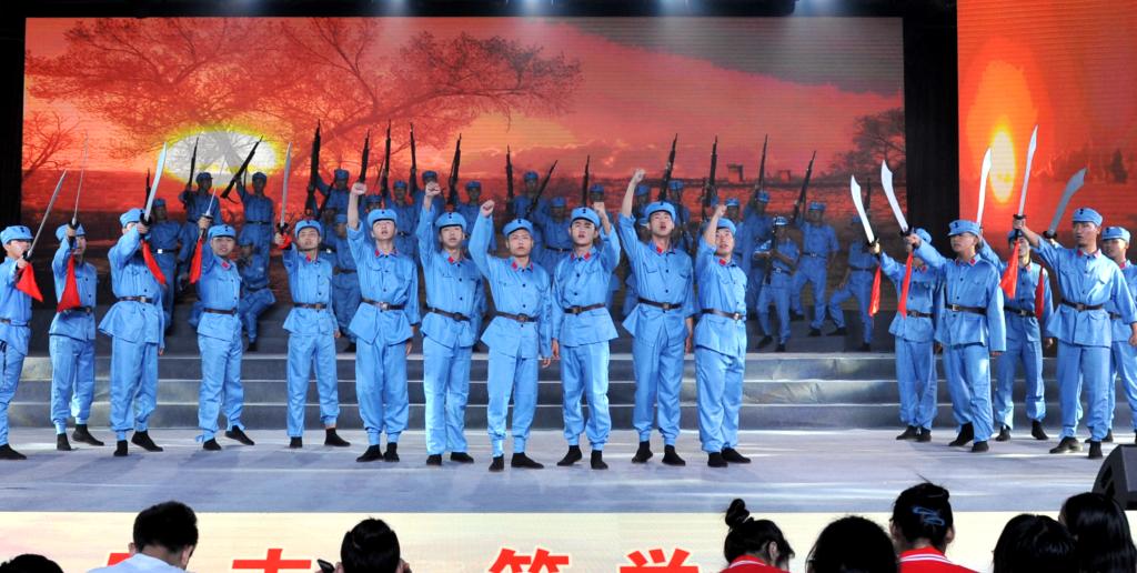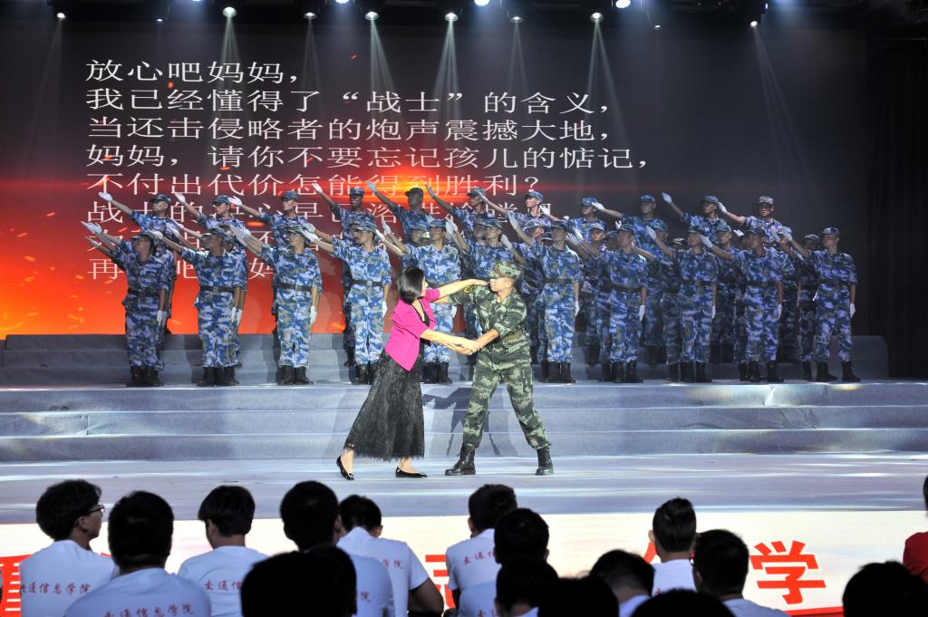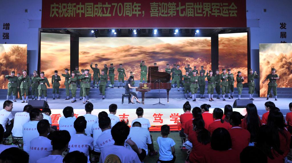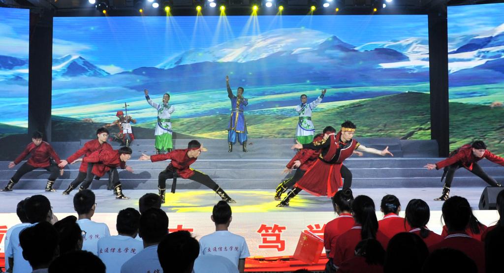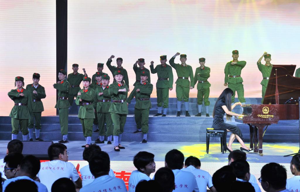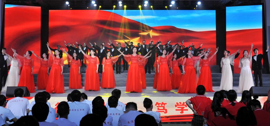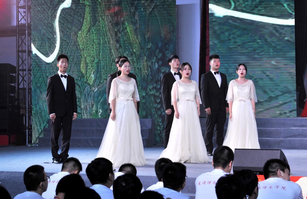 颁奖典礼结束后,庆祝新中国成立70周年师生文艺汇演拉开序幕。汇演共有三个篇章,以新中国成立发展史为主线,用合唱和歌舞表演的形式展现了中国在党的领导下一步步走向繁荣昌盛的发展过程。饱含深情的合唱《我和我的祖国》传达了交院人对祖国的殷切的祝福和无限的热爱,在这种浓浓的家国情怀中,第一篇章“没有共产党就没有新中国”正式上演。庄严肃穆的情景合唱《国际歌》展现了在国际共产主义运动的背景下中国人民奋起反抗的声音,节奏紧凑的《秋收起义》再现了工农革命军举行的一次武装起义,中国共产党第一次在武装斗争中公开打出了自己的旗号,韵味悠长的《红军阿哥你慢慢走》流露了红军战士随军北上时亲人的不舍之情,气氛悲壮的《过雪山草地》展现了红军二万五千里长征路上的艰辛和力量,生动活泼的《游击队歌》《太行山上》以表演与合唱共同演绎了灵活机动的游击战士形象,钢琴伴奏配合气势雄壮的《保卫黄河》大合唱为第一篇章画下句号。充满异域风情的歌曲串烧《送我一枝玫瑰花》《嘎达梅林》《半个月亮爬山来》《远方的客人请你留下来》,伴随着优美、灵动的舞蹈开启了第二篇章“承载梦想与希望”,动人心怀的合唱表演《再见吧妈妈》、让人热血沸腾的《把青春压进枪膛》展现了军人的保家卫国的赤子之心,亲切生动的《我的祖国》唱出了对祖国、对家乡的无限热爱之情和英雄主义的气概,展现了新中国成立之后蓬勃向上的风貌。四首气势磅礴的合唱唱响祖国的“时代新篇章”,统一的白、红晚礼服和黑色西服唱出了《在灿烂的阳光下》新中国的新风貌,宛转悠扬的《红旗飘飘》唱出了对祖国的赤子之心,催人奋进,大气磅礴、委婉动听的《不忘初心》提醒大家要不忘初心,时刻铭记祖国伟大复兴的使命,在全体校领导参与合唱的最后一曲《歌唱祖国》中,大家纷纷挥动手中的红旗,一起大声合唱,为整场文艺汇演画上圆满的句号。
