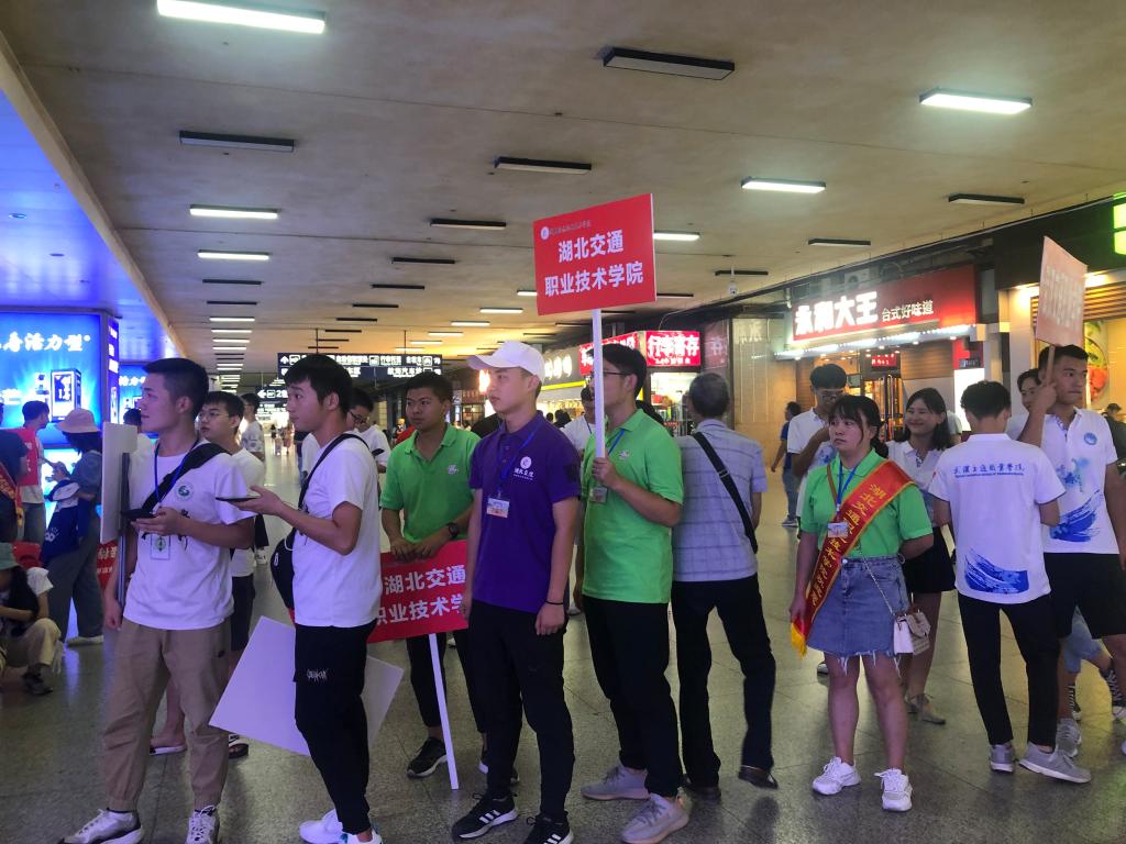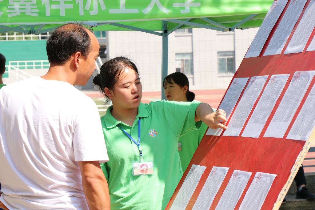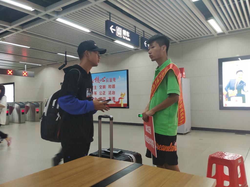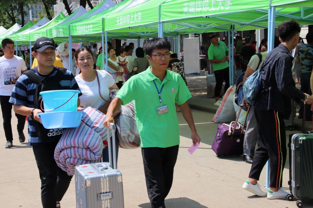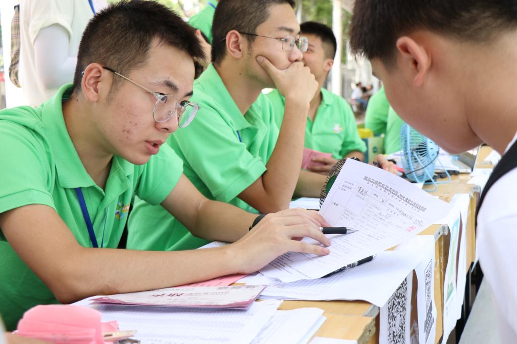 学校在操场边搭起了长长的一排迎新篷,拉着醒目的横幅,各部门、各二级学院的迎新工作人员也提前驻守在各自的迎新点,身着草绿色统一T恤的志愿者随处可见,还有志愿者在火车站、地铁口驻点等待新生。报到的学生和家长们络绎不绝,他们在志愿者的引导下有条不紊地进行着各项入学报到工作。