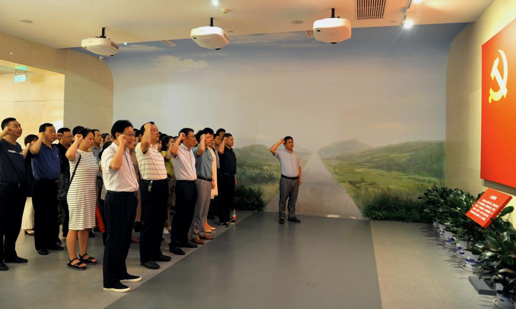 在鲜红的党旗下,参观的全体党员干部重温了入党誓词,慷慨激昂的誓言响彻现场,庄严肃穆的气氛感染在场每一位党员干部,表达了党员干部们不忘初心、牢记使命,树牢“四个意识”,坚定“四个自信”,坚决做到“两个维护”的决心与信心。