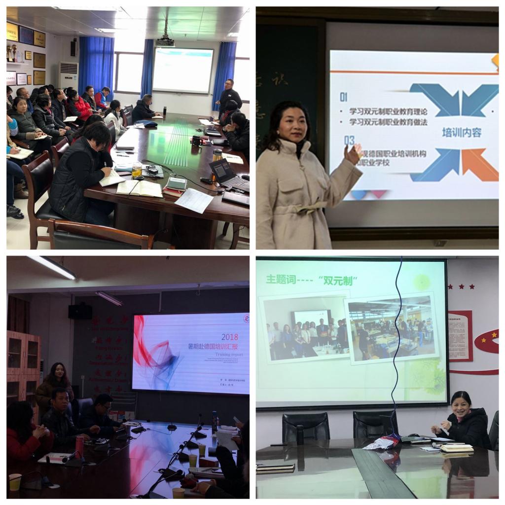 为借鉴德国先进职业教育理念与成功经验,开阔教职工国际视野,2018年8月,学校从教职工中选派优秀代表共计12名赴德国参加“交通应用型人才培养的教学方法与课程标准”课程培训。培训结束回校后,各二级学院(部)按照赴德培训工作统一要求,组织开展内部分享交流汇报会,汇报德国职业教育先进理念、办学思路、校企合作方式等。