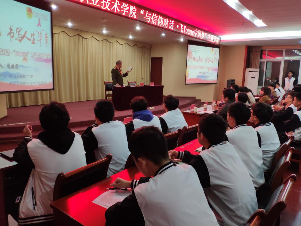 11月28日,原武汉军区空军政治部宣传部部长、“老战士报告团”团长毛兰成应邀出席yl6809永利官网“与信仰对话·飞Young中国梦”主题报告会,为全校共青团干部、校青马班学员、入党积极分子代表近两百人作了一场感人至深、催人奋进的精彩报告,在同学中引起了强烈反响。卓刀泉街道团工委书记白佳威、委员徐慧参加了本次活动,报告会由校团委李阳主持。