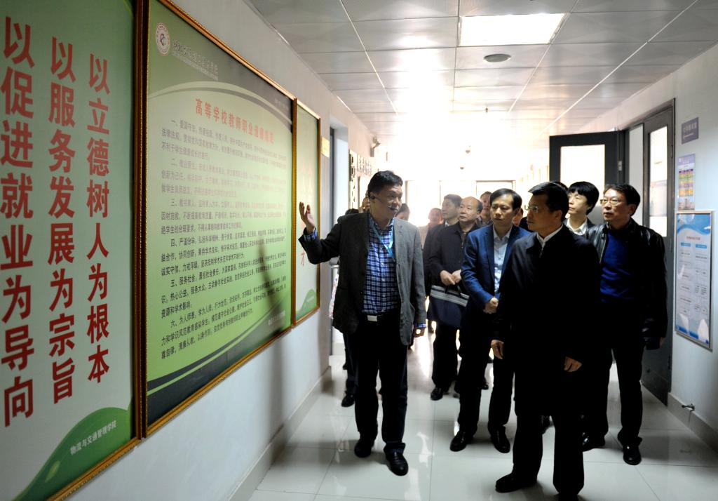 在物流与交通管理学院,陶宏一行参观了文化长廊,听取了该院专业建设、师资队伍建设、校企合作、文化建设、学生管理等情况汇报,陶宏对物流与交通管理学院以党建引领、文化熏陶,引导学生人人进步、人人出彩的特色做法予以充分肯定。陶宏一行来到该院党员活动室,详细了解了基层党组织建设、学生党员发展情况,现场查看了党建工作台账资料,翻阅了党建刊物,当了解到学校与社区深化区校融合,共建“信仰空间”,共同打造“青马工程”,并选派学生参与社区治理时,陶宏表示充分赞赏。随后,陶宏来到学生服务中心,详细询问了辅导员队伍情况,对大家付出的艰辛和努力表示感谢,并勉励现场办公的辅导员老师,用心用情培养、服务好学生,促进学生全面发展、成长成才。