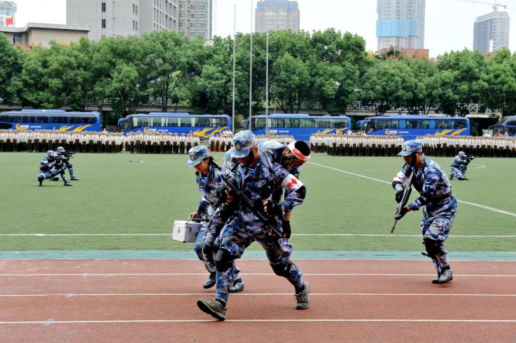 在庄严的国歌声中五星红旗冉冉升起,闭营式正式开始。迎校旗仪式之后,校领导在军训团首长的陪同下,对各方阵进行检阅。在校旗的带领下分列式开始,各方阵依次经过主席台,全体参训学员口号嘹亮、步伐整齐,赢得了主席台上各位首长和领导的阵阵掌声。由武警、海军、空军士官班组成的三个连队让人眼前一亮,他们身着统一制服,精神饱满、气宇昂轩地走过主席台,将阅兵推向高潮。军训成果汇演内容丰富:战术表演生动逼真,让人身临其境;海军旗语表演整齐划一,凸显专业内涵;军体拳表演气势磅礴,引人入胜;军歌合唱声音嘹亮,振奋人心。