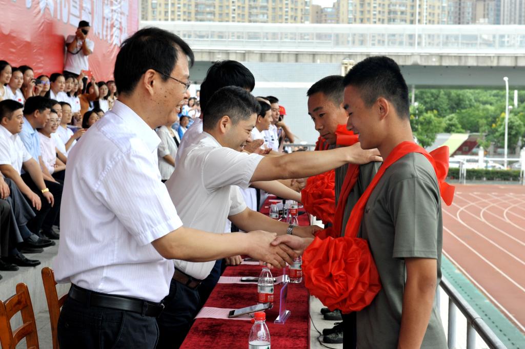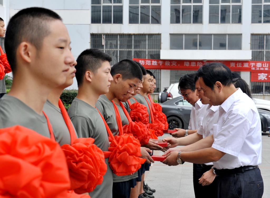 会后,学校领导为入伍新兵代表佩戴大红花,并颁发纪念章,并在学校教学大楼前合影留念。(摄影/张骊)