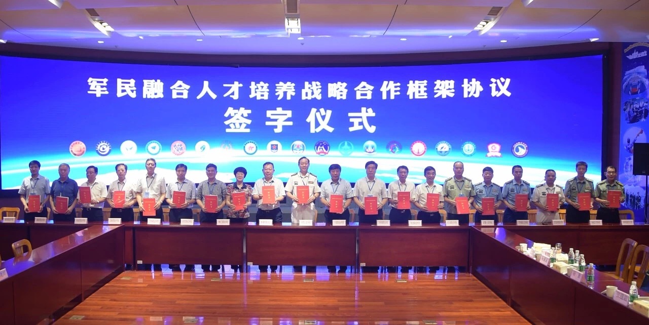 7月17-18日,军民融合人才培养战略合作框架协议签字仪式暨研讨交流会在蚌埠海军士官学校举行。中央军委训练管理部院校局、海参训练局院校教育处以及军地20所院校参加会议,学校校长陈方晔、副校长谢彤率相关部门负责人一行4人出席大会。