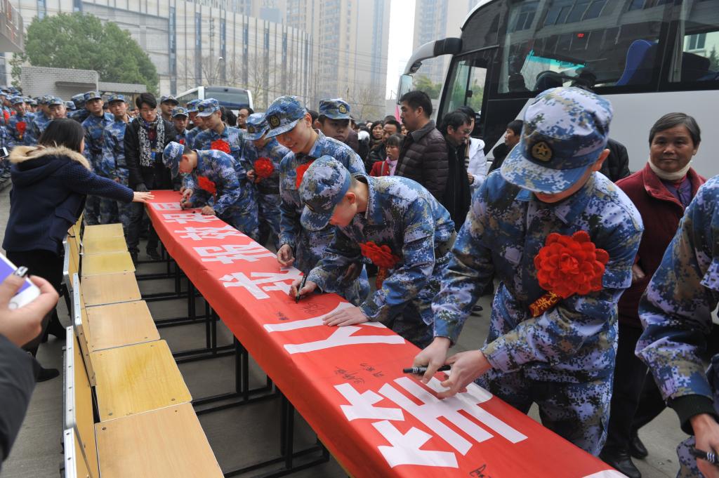 88名即将入伍的海军定向培养士官生胸佩红花,精神抖擞,队列整齐,戎装待发。部队和学校领导一起为即将入伍的士官生颁发应征入伍通知书。2015级士官生在“携笔从戎报效祖国”的横幅上签字后踏上奔赴海军工程大学的汽车,学校领导、老师和家长们与2015级士官生一一话别,祝福他们一路顺风、前程似锦。(摄影/张鹏)