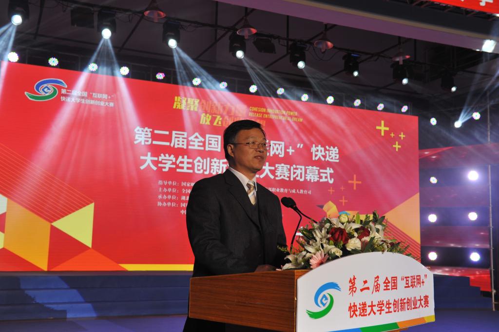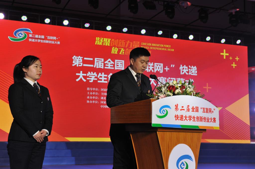 全国邮政职业教育教学指导委员会秘书长陈兴东代表主办单位方致辞。他指出本次大赛意义重大,希望通过大赛,进一步激发大学生创新创业热情,推动创新创业成果的转化,促进快递业转型升级和提质增效,进一步探索建立以创新创业为导向的人才培养机制,完善产学研用结合的协同育人模式,推动互联网+快递的融合发展,积极引导广大青年学生立足快递行业,面向基层一线,抓住发展机遇,自觉成为中国特色社会主义伟大事业和全面建成小康社会的积极实践者,为推动快递转型发展和实现伟大中国梦作出积极贡献。