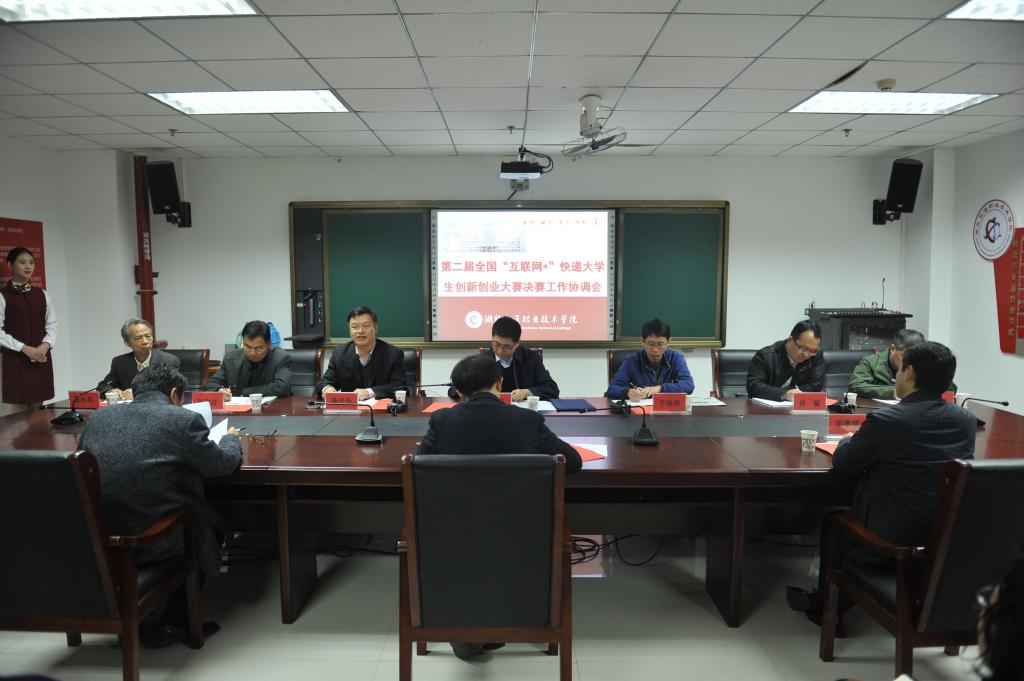 11月16日,国家邮政局人事司副司长袁聿东一行来我校参加第二届全国“互联网+”快递大学生创新创业大赛决赛工作协调会检查情况,指导并协调大赛各项筹备工作的落实。出席会议的还有国家邮政局人事司副调研员于继锋、孙伟言,湖北省邮政管理局党组成员孙猛,全国邮政职业教育教学指导委员会秘书长陈兴东,湖北省邮政行业职业技能鉴定中心主任张小兵和我校领导。