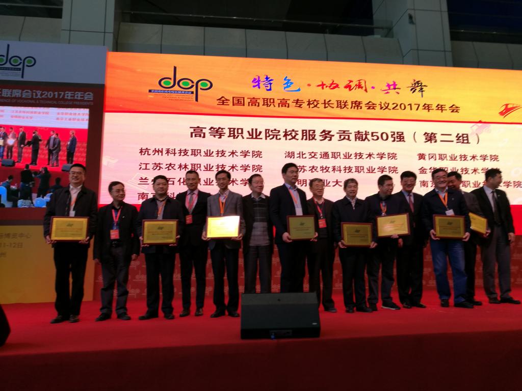 11月10日—12日,全国高职高专校长联席会议2017年年会在江苏常州召开,副校长王孝斌、教务处副处长黄六胜参加会议。依据高职院校毕业生人数和就业去向、横向技术服务到款额、纵向科研经费到款额、技术交易到款额、非学历培训到款额、公益性培训服务等七项指标,我校量化排名全国居前,荣获“高职高专院校服务贡献50强”称号。