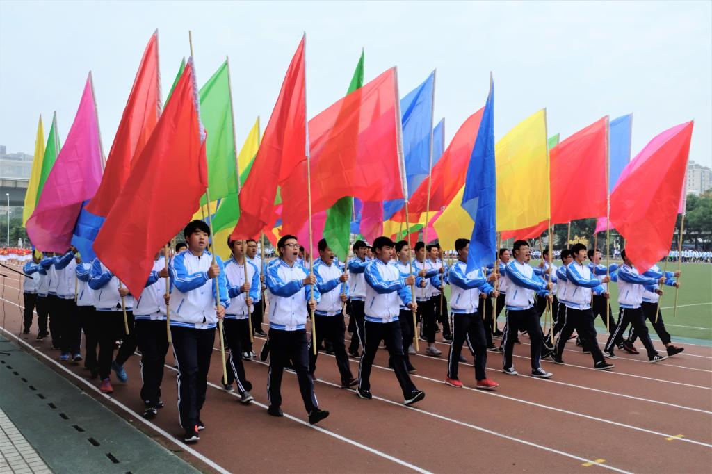 伴随着庄严的国歌,五星红旗冉冉升起,全体师生集体起立,唱国歌,行注目礼。校长陈方晔致开幕词,他结合习近平总书记十九大报告中“要广泛开展全民健身活动,加快推进体育强国建设”的指示,指出本届运动会是我校跟随党的步伐不断奋进、砥砺前行的一次重大活动,是我校践行中国梦与体育强国梦结合的一次重大盛会,更是我校万千学子以昂扬之态传递青春梦想的一次生动实践。他希望全体运动员在此次运动会中弘扬中华体育精神,弘扬体育道德风尚,坚定自信,奋力拼搏,谨记习总书记教导,不忘初心,砥砺前行,把2017年田径运动会举办成一个青春蓬勃、热烈精彩的盛会。