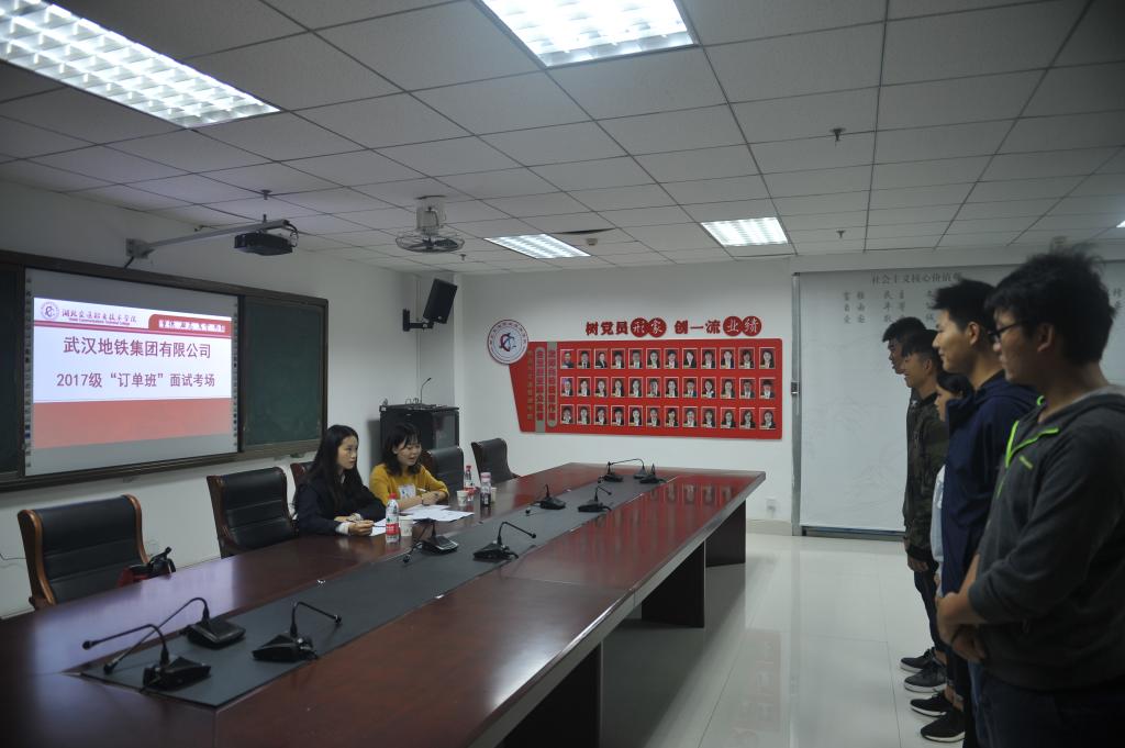 10月20日,武汉地铁集团到我校进行第三届订单班学生面试,300多名符合面试要求的大一学生积极报名参与面试,学校副校长王孝斌到现场为学生加油鼓劲。
