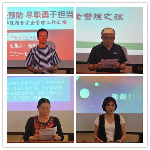 会上,四个部门分别围绕宿舍安全管理、实训室安全管理、食品安全管理和学生安全教育作了大会交流发言。保卫处处长曾祥成通报了近期学校安全工作情况。