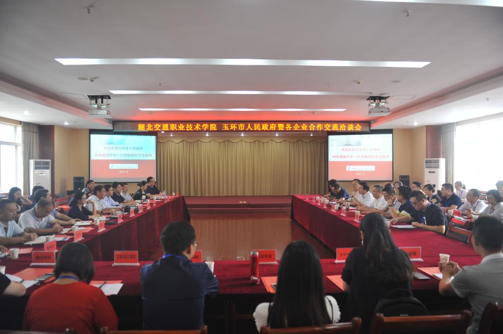 与会双方一起观看了我校宣传片。在深入了解我校鲜明的专业特色、悠久的办学历史和丰硕的办学成果后,柯寿建副市长情不自禁地赋诗一首“煌煌六十载,熠熠一甲子,送走五万兵,而立正当年,有幸来楚州,心潮澎湃多,湖北交职院,青春活力场,校企齐合作,携手共发展”,并表示将在人才培养模式、学生就业等方面与我校进一步展开合作,携手建立技能人才培养基地,一起助力玉环市企业创业创新和产业转型升级。