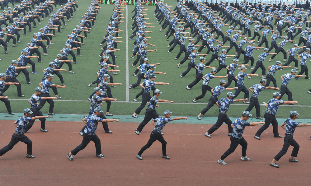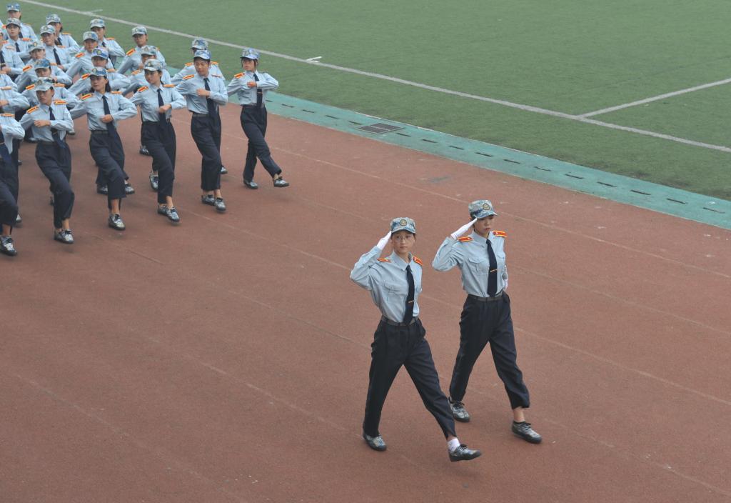 随后,在校旗的带领下,在雄壮的《中国人民解放军军歌》的伴奏中,各方阵沿着阅兵道依次正步经过观礼台。全体参训学员口号嘹亮、步伐整齐,赢得了观礼台上各位首长和领导的阵阵掌声。之后,军事训练成果汇报“彩旗”、“军体拳”表演展现了军训团昂扬的精神面貌和军人的飒爽英姿。