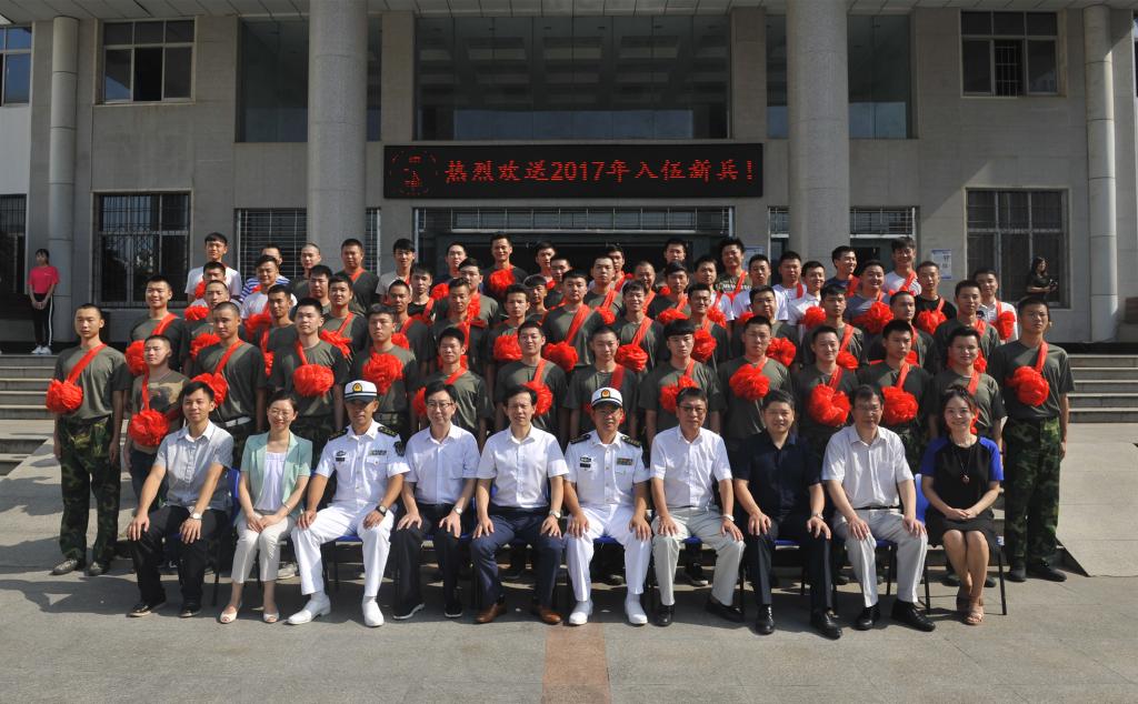 会后,学校领导、2017级军训团领导与72名入伍新兵在学校大楼前合影留念。(摄影/张鹏 高亚 吕义猛 饶蝶)