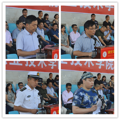 伴着雄壮的国歌,五星红旗冉冉升起,开营式正式拉开帷幕。校武装部副部长曾祥成宣布军训团成立。海军工程大学电气工程学院研究生管理大队鞠凯中、物流与交通管理学院党总支副书记周希林、公路与轨道学院17010110班余云龙分别代表军训教官、教导员和新生代表发言,表达了团结一心、奋勇拼搏,圆满完成军训任务的决心和信心。