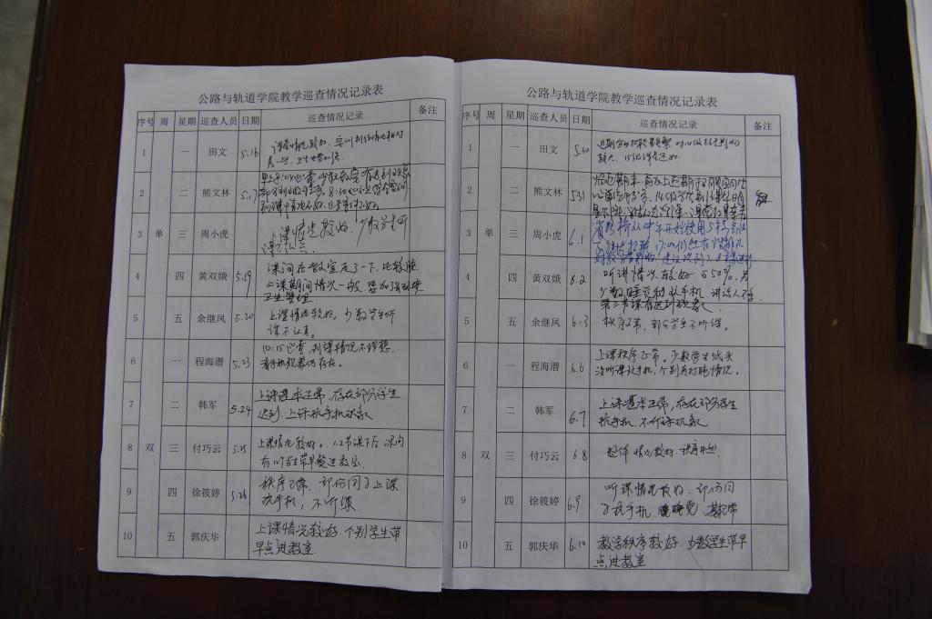 《教学管理每日巡查管理办法》要求公路与轨道学院所有领导和教学督导人员担任教学巡查员,分单双周每人每天不定时进行教学巡查,并详细填写教学巡查情况记录表,将巡查的结果及时在公路与轨道学院的QQ群上通报,对教师们做得好的地方予以表扬,做得不足的地方提出整改建议。日常化,常态化的教学巡查不仅是促进教风学风建设的有效手段,还搭建了学院领导、教学督导与一线教师之间沟通的桥梁。