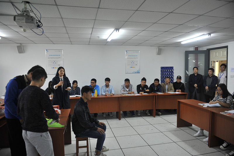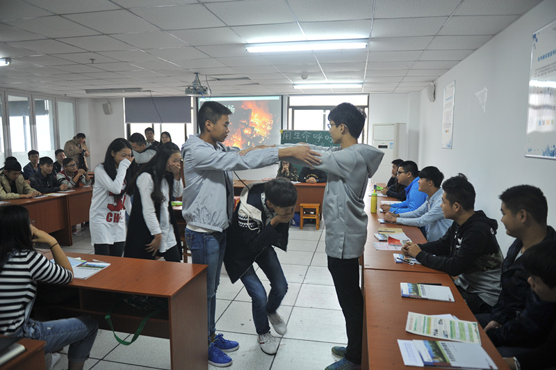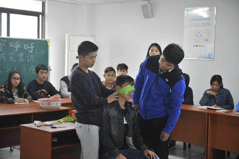 随后,刘畅一行来到在交通信息学院1603053班的“防灾减灾”主题班会上进行听课。在班会上,老师现场讲解人工呼吸、伤口包扎、火灾疏散等防灾减灾知识,以及逃生方法和自救的基本技能,并组织学生进行了现场演示。在火灾疏散演练中,参演学生头戴防护面具或湿毛巾,俯身从安全通道撤离,形象而生动的表演赢得了老师和同学们的阵阵掌声。