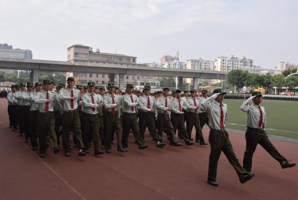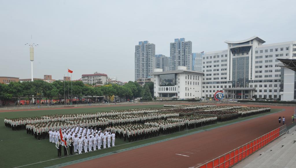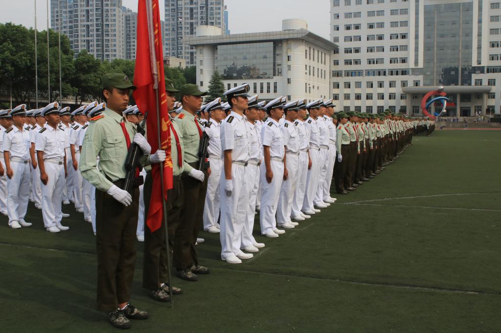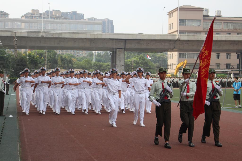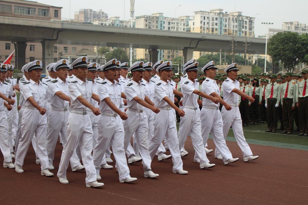 在激昂的军乐声中,各二级学院方阵踏着整齐的步伐依次走过主席台接受检阅,响亮的口号,矫健的步伐,高昂的士气博得现场领导、师生的阵阵掌声。军训成果汇报表演环节别出心裁,由260名女生组成的海军旗语方阵用整齐划一的动作、丰富多变的组合表达出“重德、励志、笃学、尚能”的校训,并摆出学校英文缩写字母造型结束表演,成为运动场上最靓丽的风景,赢得了现场师生的阵阵欢呼;由500余名男生组成的军体拳方阵转体出拳踢腿,擒拿术帅气逼人,动作一气呵成,标准利落,阵阵响亮充满力量的“杀”的口号久久回荡在田径运动场,他们将军人的钢铁意志与军拳紧密结合,展现了军人的飒爽英姿。随后,西区士官班学生身穿统一的海员制服,作了精彩、专业的队列表演。最后,全体同学合唱军旅歌曲《当祖国召唤你的时候》,声音嘹亮,气势磅礴,将阅兵式推向高潮。