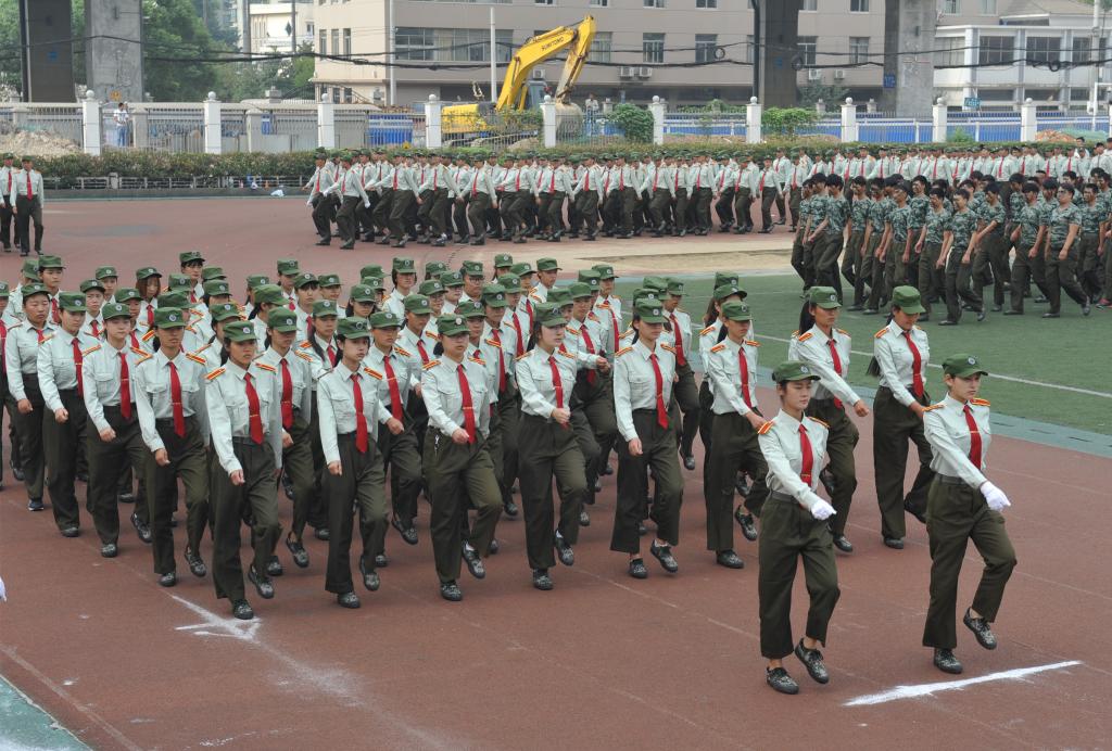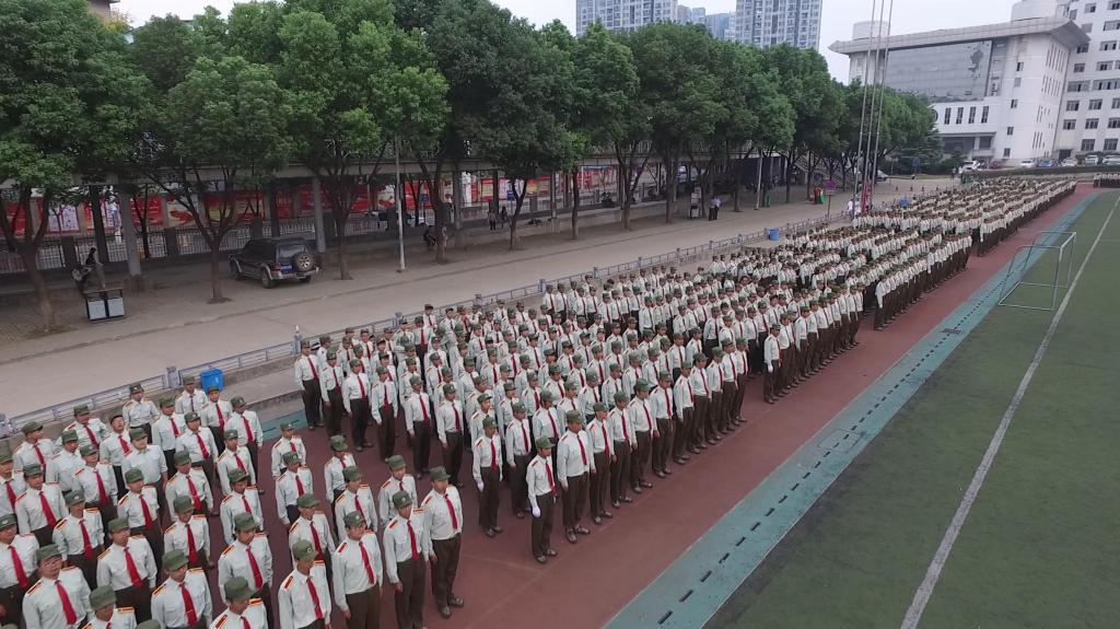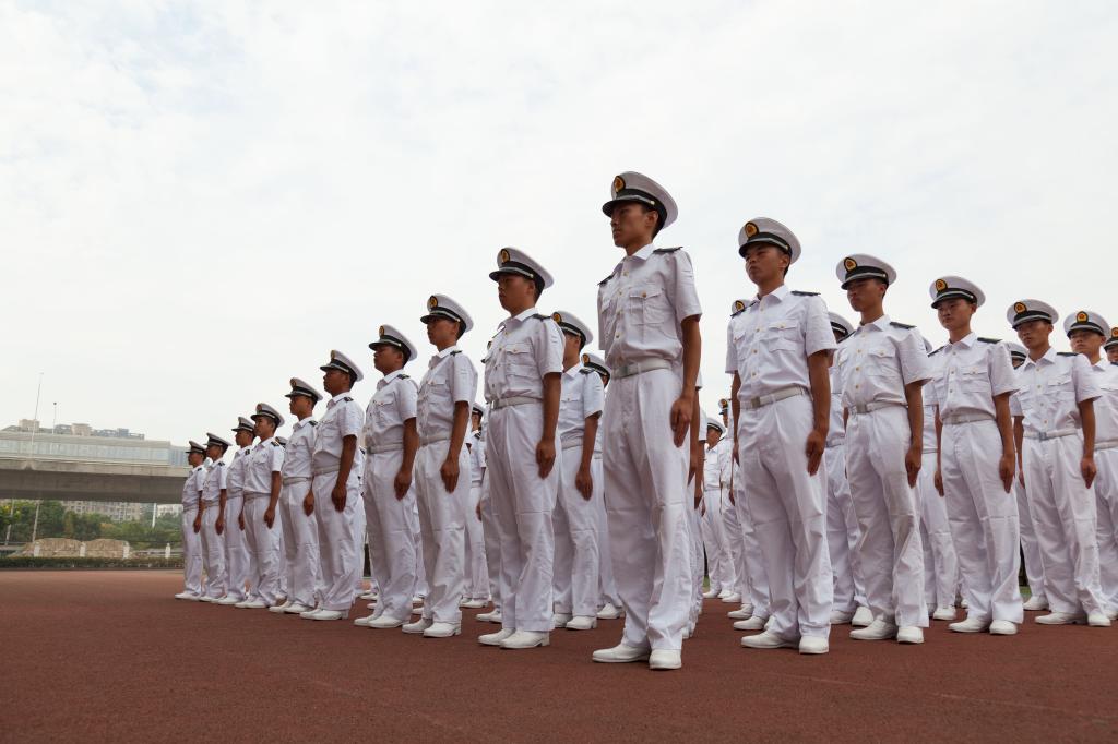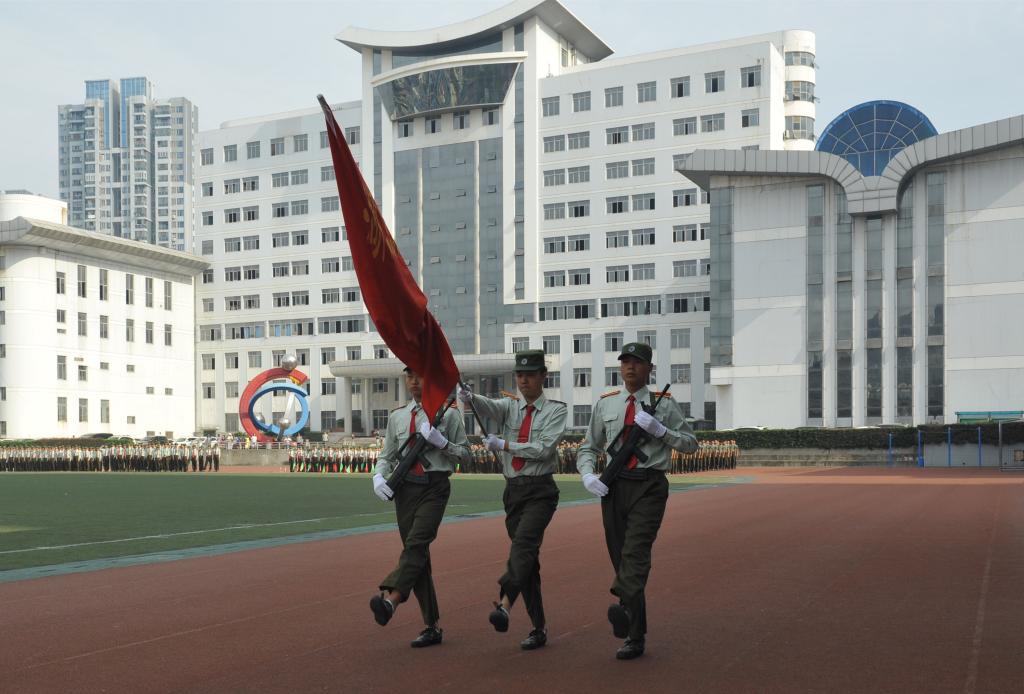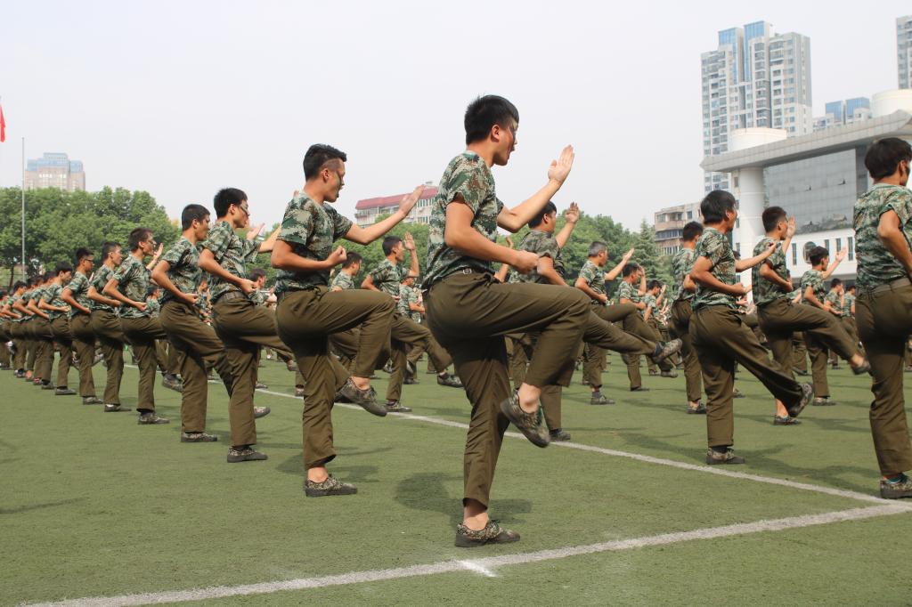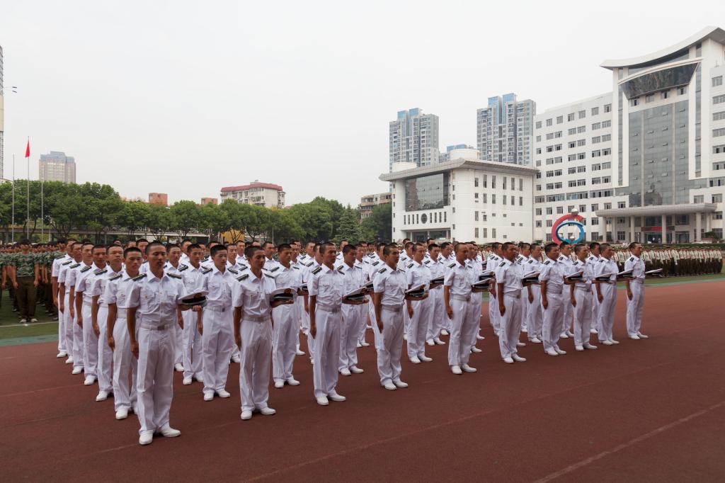 在激昂的军乐声中,各二级学院方阵踏着整齐的步伐依次走过主席台接受检阅,响亮的口号,矫健的步伐,高昂的士气博得现场领导、师生的阵阵掌声。军训成果汇报表演环节别出心裁,由260名女生组成的海军旗语方阵用整齐划一的动作、丰富多变的组合表达出“重德、励志、笃学、尚能”的校训,并摆出学校英文缩写字母造型结束表演,成为运动场上最靓丽的风景,赢得了现场师生的阵阵欢呼;由500余名男生组成的军体拳方阵转体出拳踢腿,擒拿术帅气逼人,动作一气呵成,标准利落,阵阵响亮充满力量的“杀”的口号久久回荡在田径运动场,他们将军人的钢铁意志与军拳紧密结合,展现了军人的飒爽英姿。随后,西区士官班学生身穿统一的海员制服,作了精彩、专业的队列表演。最后,全体同学合唱军旅歌曲《当祖国召唤你的时候》,声音嘹亮,气势磅礴,将阅兵式推向高潮。